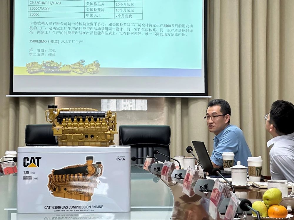 会议进行过程中,金年会·jinnian(金子招牌)信誉至上船机销售经理翟宏强先生针对镇江船厂尤为关注的 CAT 发电机组生产周期的优化以及产品证书的完善等问题,给予了详尽的解答。无独有偶,船机资深应用经理戎恺先生也慷慨分享了 CAT 的最新产品以及研发进度。