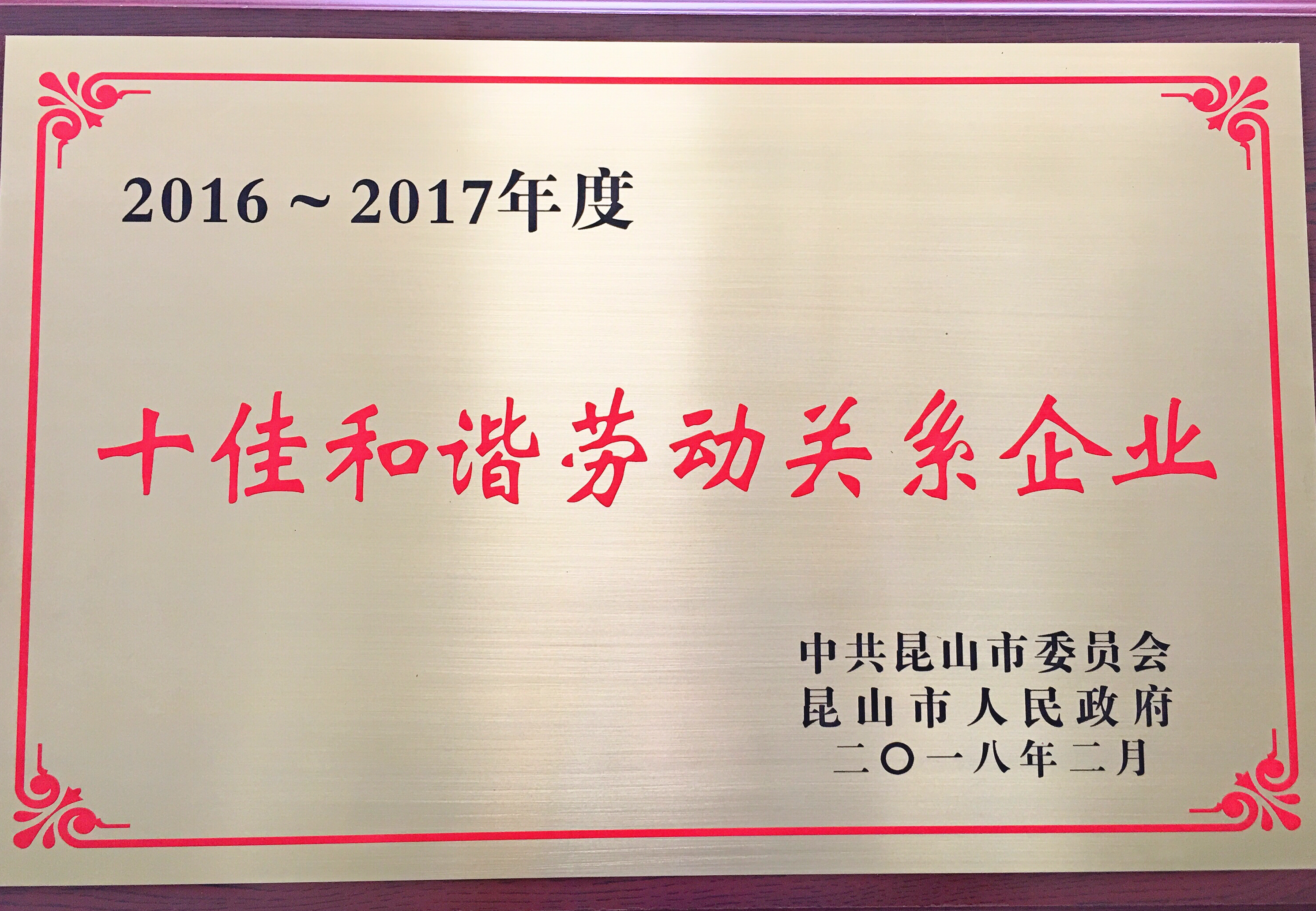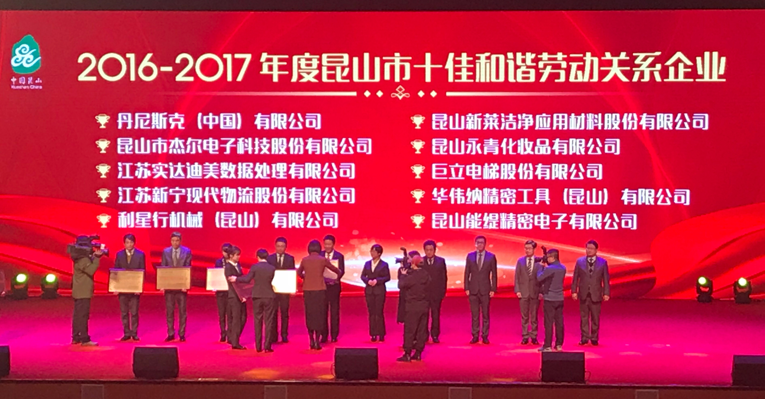 2018年2月28日,在昆山市2017年度转型升级表彰大会上,金年会·jinnian(金子招牌)信誉至上机械(昆山)有限公司被授予2016~2017年度昆山市“十佳和谐劳动关系企业”称号,金年会·jinnian(金子招牌)信誉至上机械集团首席执行官傅耀生先生代表公司参加表彰大会并领取奖牌。